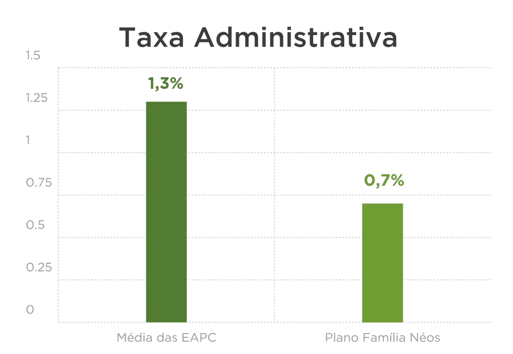 Ao contratar uma previdência em bancos ou seguradoras, você paga diversas taxas, como carregamento, administração e performance, que cobrem despesas e geram lucros para a instituição. No Plano Família Néos, a rentabilidade vai diretamente para os participantes, com apenas uma taxa mínima de administração. Ou seja, mais rentabilidade para você e menos custos!